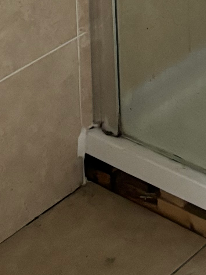 We were called to this leaking shower tray that had been leaking through the ceiling when in use, our initial investigations found that the factory seal on the screen had failed allowing water to get through onto the floor and down a small gap in the poorly fitted plinth. The sealant around the tray did not appear to be leaking, however it had been very poorly sealed up with clear sealant that had got all over the tray and tiles and a poor quality plastic edging strip had been stuck over the top.